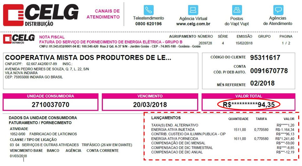 1. Conta de energia CELG mostrando a energia compensada com a geração solar remota:
