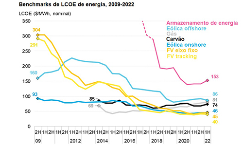 Retroagindo ao LCOE de 2019, as estimativas de custo para implantação de novas usinas solares em larga escala subiram para US$ 45/MWh, enquanto as de eólicas onshore foram para US$ 46/MWh no primeiro semestre de 2022, segundo a análise da BNEF. Apesar da perda de terreno, o resultado recente ainda marca uma redução de 86% e 46%, respectivamente, desde 2010 em termos nominais.